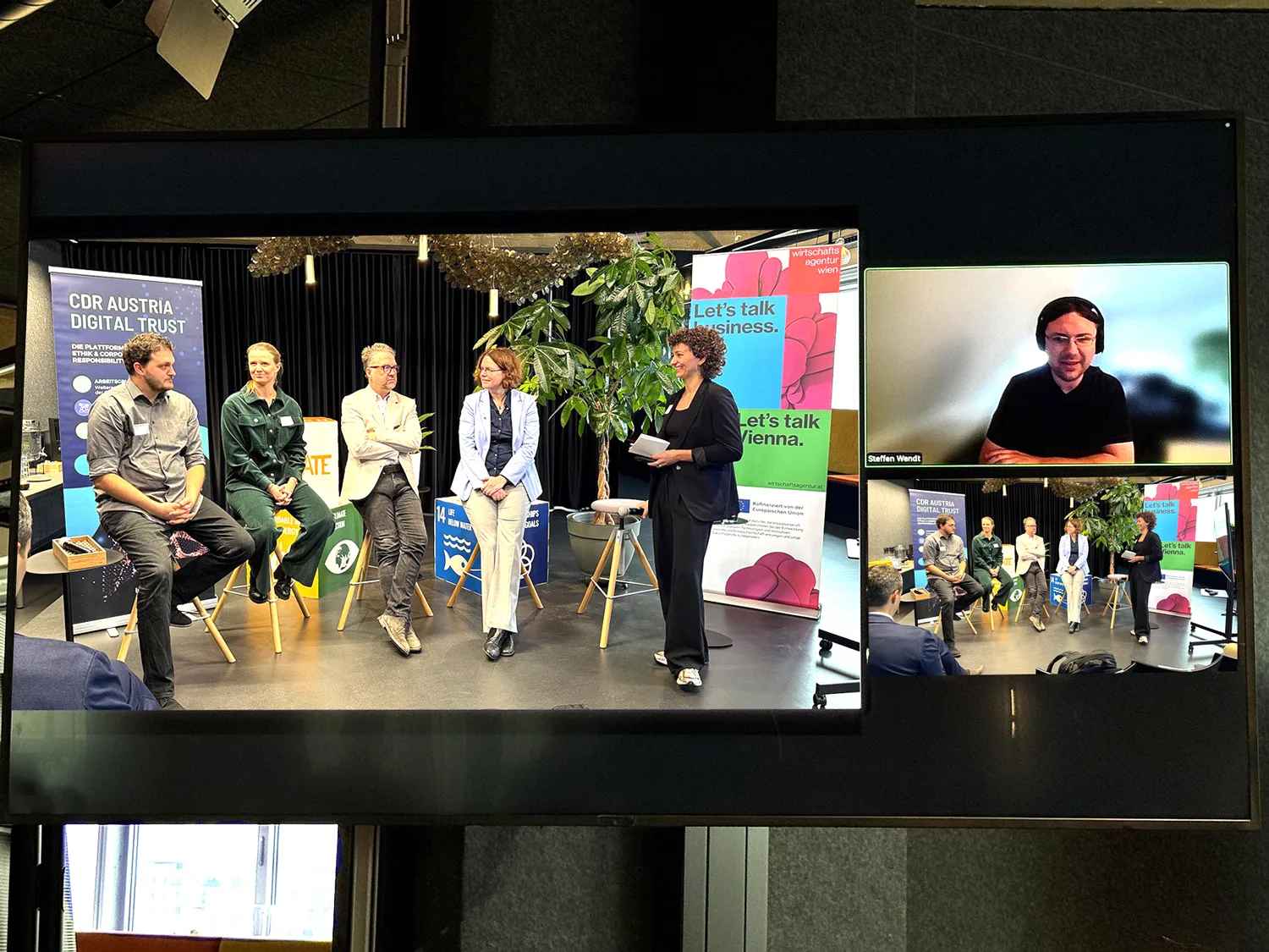 Wir bieten hochwertige audiovisuelle Ausstattung, darunter bis zu drei Bildschirme, ein professionelles Soundsystem, Beleuchtung und hybride Technik. Wir verfügen über eine zuverlässige, schnelle Glasfaser-Internetverbindung für Live-Streaming oder Remote-Participation.